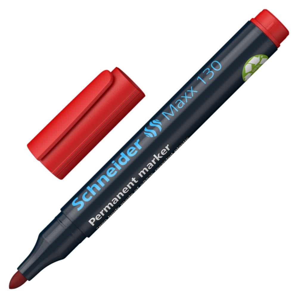 Permanent marker, line width 1-3 mm. Font color red. Its body is made of 95% recycled plastic, the internal ink tank is made of 75% recycled fibres. For writing on cardboard, paper, plastic, glass, metal, wood and almost all other materials. The writing is quick drying, waterproof and very light resistant. Capped paint does not dry even if the cap is removed for 2-3 days. It has a low odor and does not contain toluene and xylol.