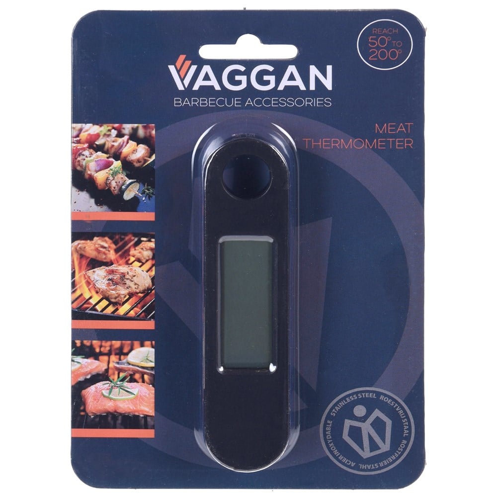 Digital meat thermometer for measuring meat. This device is made of stainless steel.
