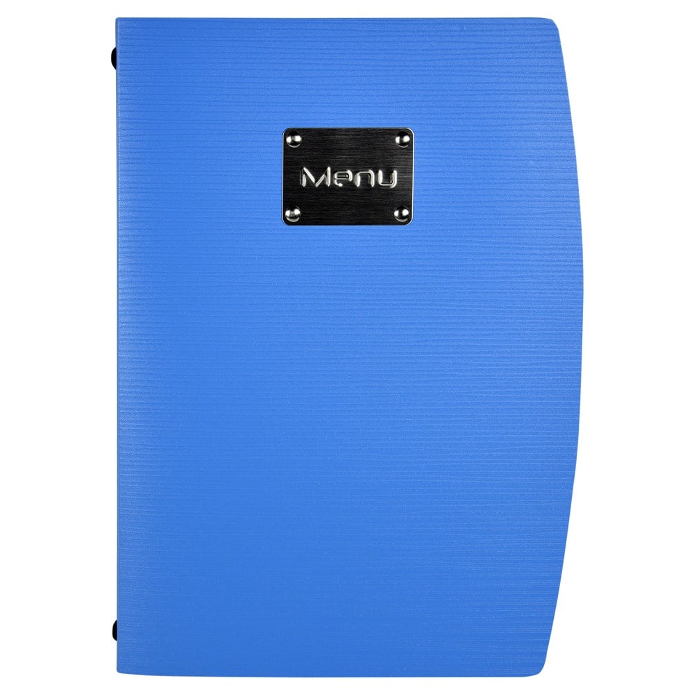 Protects Rio blue A4, 1 double insert menus included (4 views). Flexible and easy to clean. Elastic cord connecting the inserts. Wafer metal 'Menu'