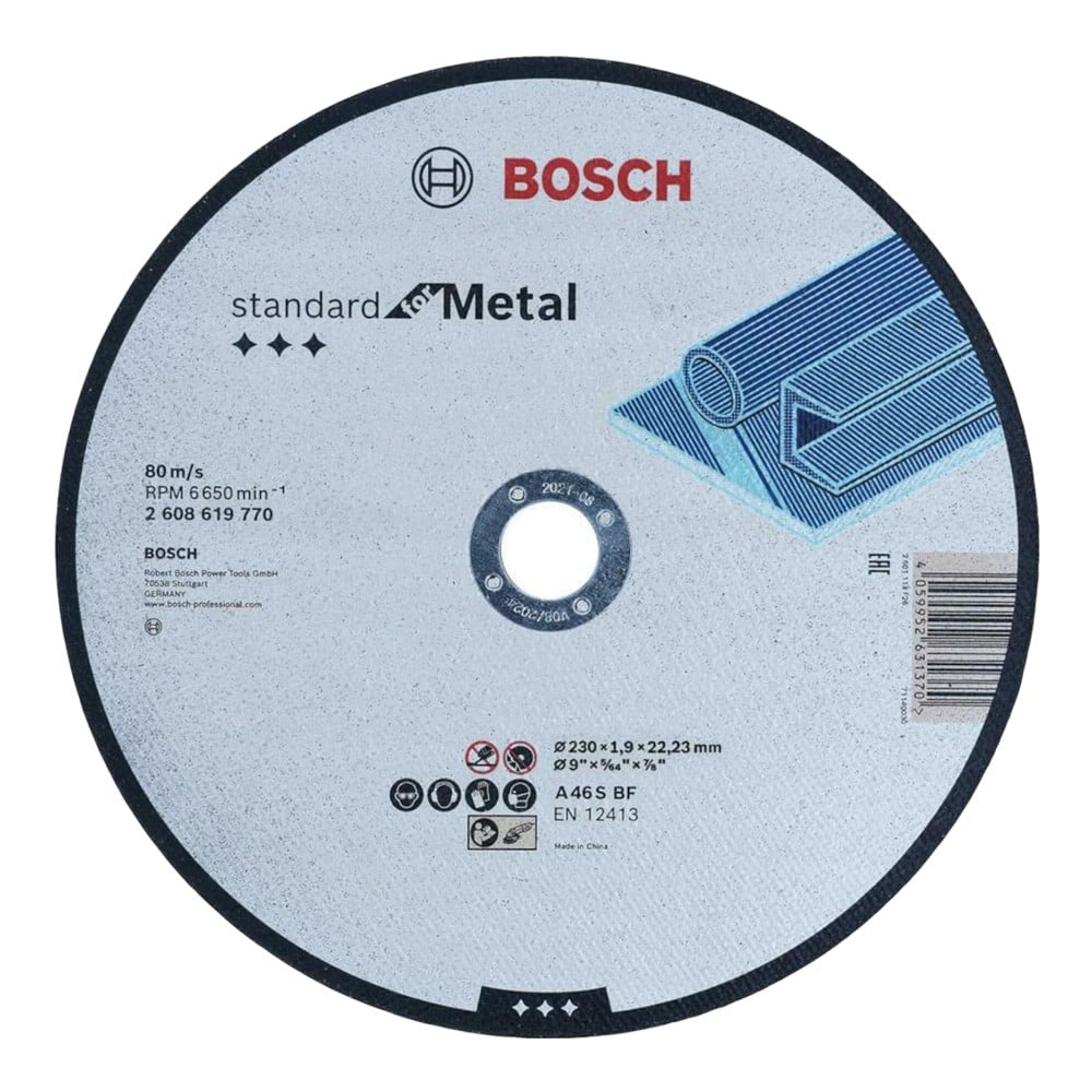 The Bosch 230x1.9x22.23 mm metal cutting disc is a quality and reliable accessory, designed for precise and clean cuts in various metals. With a diameter of 230 mm, a thickness of 1.9 mm, and a center hole of 22.23 mm, this disc is suitable for use with powerful and flexible cutting equipment. Thanks to its resistant composition and advanced Bosch technology, it ensures a long service life and high performance even in intensive use. Ideal for cutting steel, sheet metal and hard metals, this disc offers an excellent combination of speed and cutting precision. Its use guarantees high efficiency and safety at work, making it a suitable choice for both professionals and carpentry or various metal repair workers.