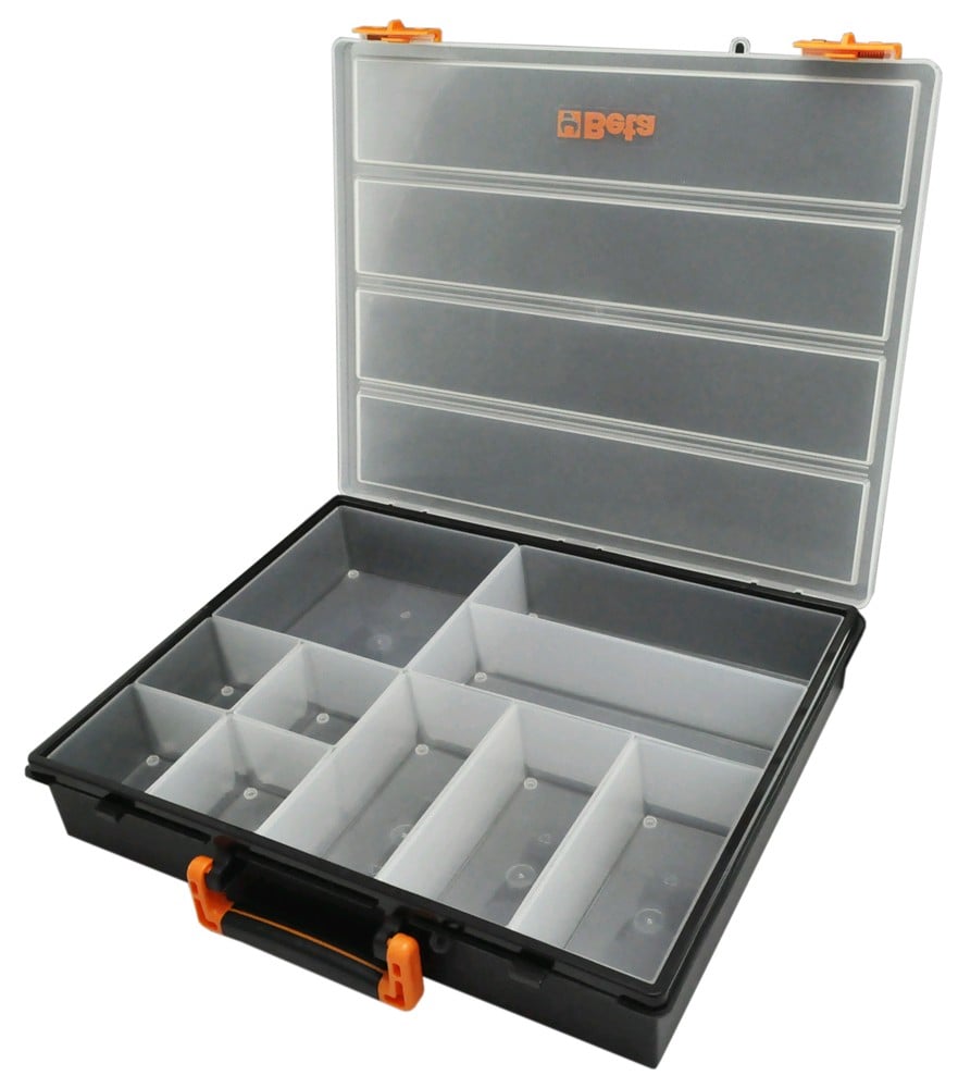This Organizer features deep, adjustable compartments that are great for organizing small parts and tools. It has a built-in handle that makes it easy to carry with you. This plastic storage case has 2 locking tabs and a lid lock, so parts stay in place.