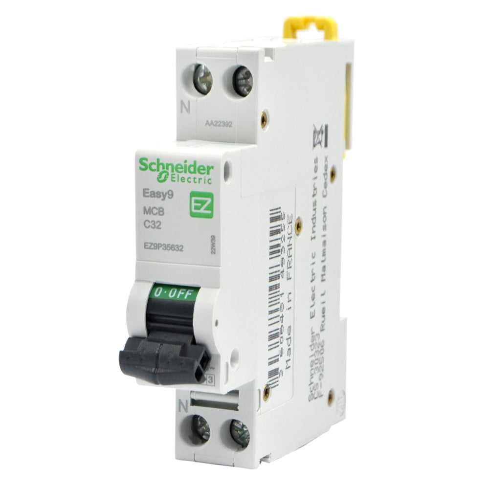 Mini Circuit Breaker 1P+N 1M 32A, 6kA, Kurba C, Easy9. There are many types of single or multi-pole electrical circuit breakers, which are manufactured to protect electrical conductors from overheating. The machines are used as separators (switches) for self-contained devices or as main separators. Thus, single-phase automatic machines are widely used in our homes for washing machines, electric ovens, refrigerators, air conditioners, etc. While the other group belongs to three-phase automata that extend to industrial use.