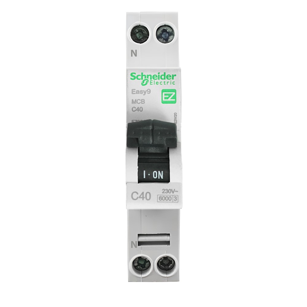 The Easy9 1P+N 1M 40A Circuit Breaker with C Curve and 6kA rating is an electrical switch designed to protect electrical installations from overloads and short circuits. This model has a 40A capacity and is equipped with a C curve, providing rapid protection against high-current surges. It operates within the standard voltage range of 220V-240V and has a breaking capacity of up to 6kA, ensuring safety and reliability for electrical systems.