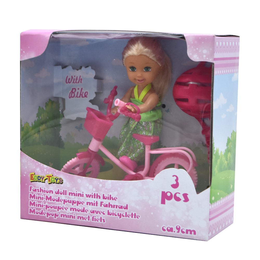 Children's toy set, which contains a small doll and a bicycle. This toy helps to develop imagination and creativity, develop motor skills and develop learning skills in young children. The constituent material and the paint have no toxic or harmful composition for children and the product is certified for children's safety. This product is suitable for use by children over 3 years old.