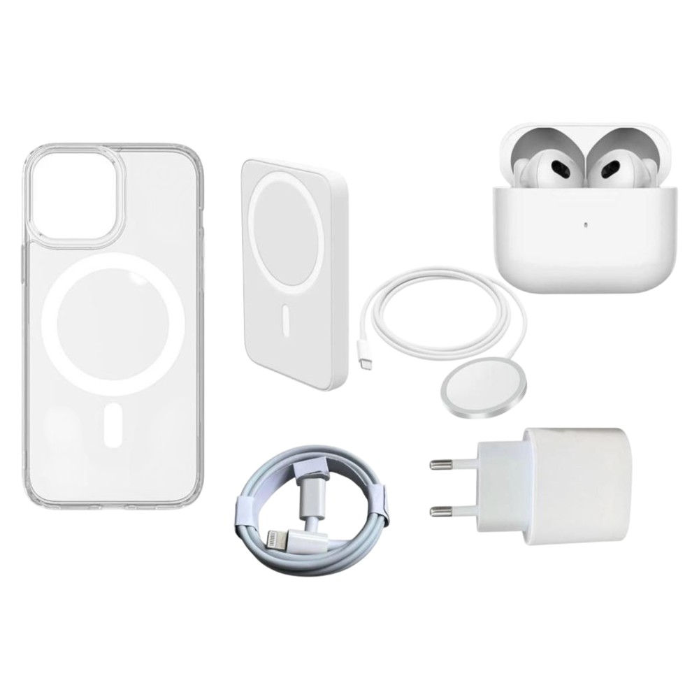 The QW33 6-in-1 iPhone Accessory Set is a complete package that includes everything you need to enhance your iPhone experience. This set is suitable for users who want to provide additional protection, convenience and functionality for their phone. It includes accessories such as a phone cover, charging cable, watch charging cable, charging head and headphones that will help you use your phone more efficiently and more protected.
