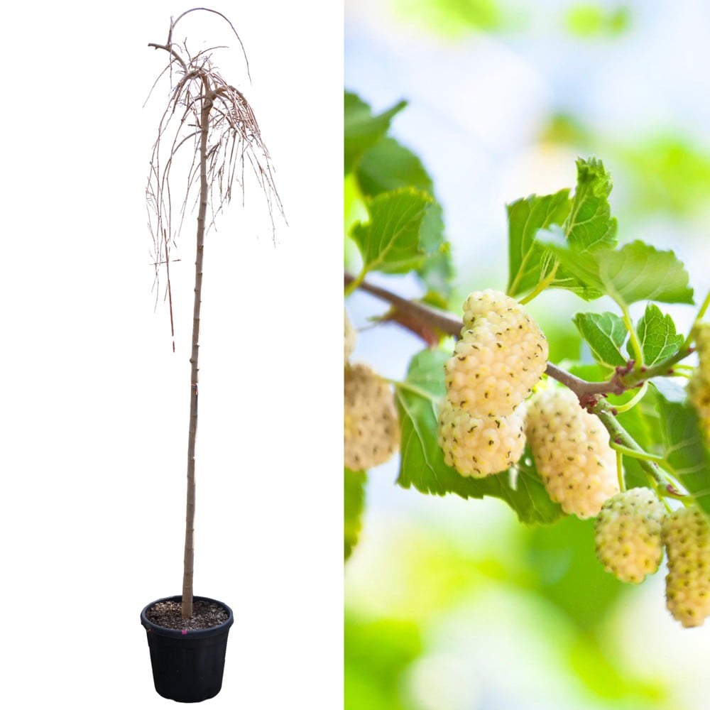 A spreading tree with heart-shaped, glossy green leaves and white mulberries which ripen to pink and red in late summer. Can tolerate a wide range soils provided they are well-drained. Prepare the ground well before planting, plant in full sun out of cold, drying winds. Little pruning is needed, only to remove low, dead, diseased or crossing branches.