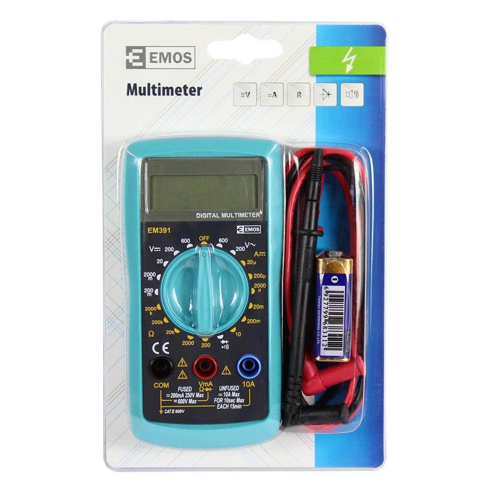 Multimeter EM391 • display with 3,5 digit appear(max 1999) • DC voltage 200mV to 600V • AC voltage 200mV to 600V • DC current 20µA to 10A • resistance 1Ohm to 2000kOhm • test diode and beep test • power battery 9V (included) • test leads (included)