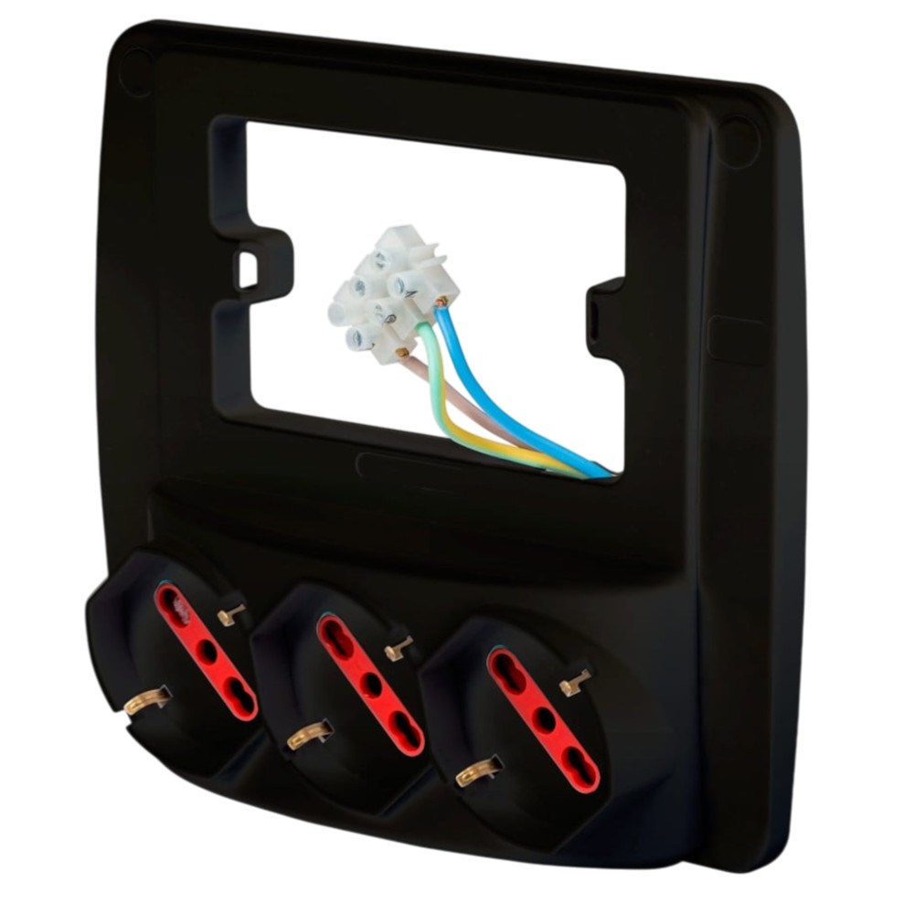 Multi-socket with 3M adhesive backing, 16A capacity and maximum power 3800W, black color. Provides safe and durable connection for electrical devices, ideal for use in the home or office. Easy installation thanks to the adhesive backing.