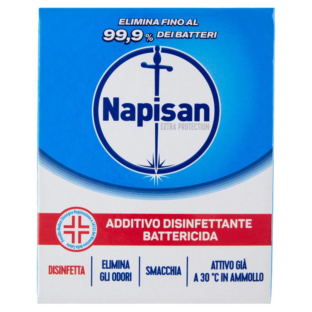 Napisan additive disinfectant bactericide powder 600 gr. Napisan Extra Protection has an effective whitening and stain remover action, eliminates odors and does not damage fabrics. It is recommended not to use Napisan Extra Protection on wool and silk garments. Microbiological tests show that Napisan Extra Protection already disinfects at 30 degrees and therefore gives the safety of hygiene on all the laundry.