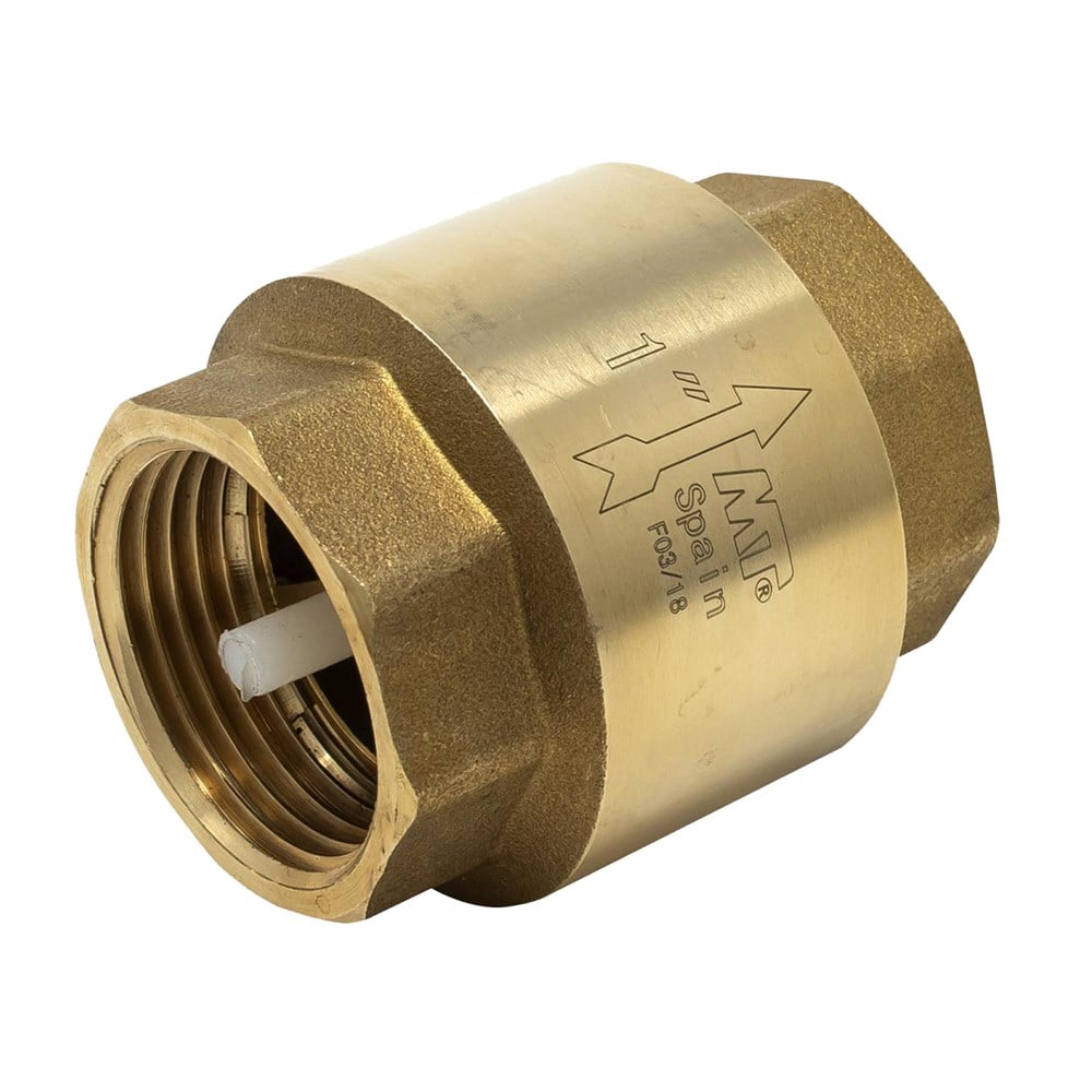 The brass check valve keeps prime in jet, submersible, and centrifugal pumps. When a pump shuts off, the check valve closes preventing the water from traveling back to the source. This check valve is constructed of heavy brass material.