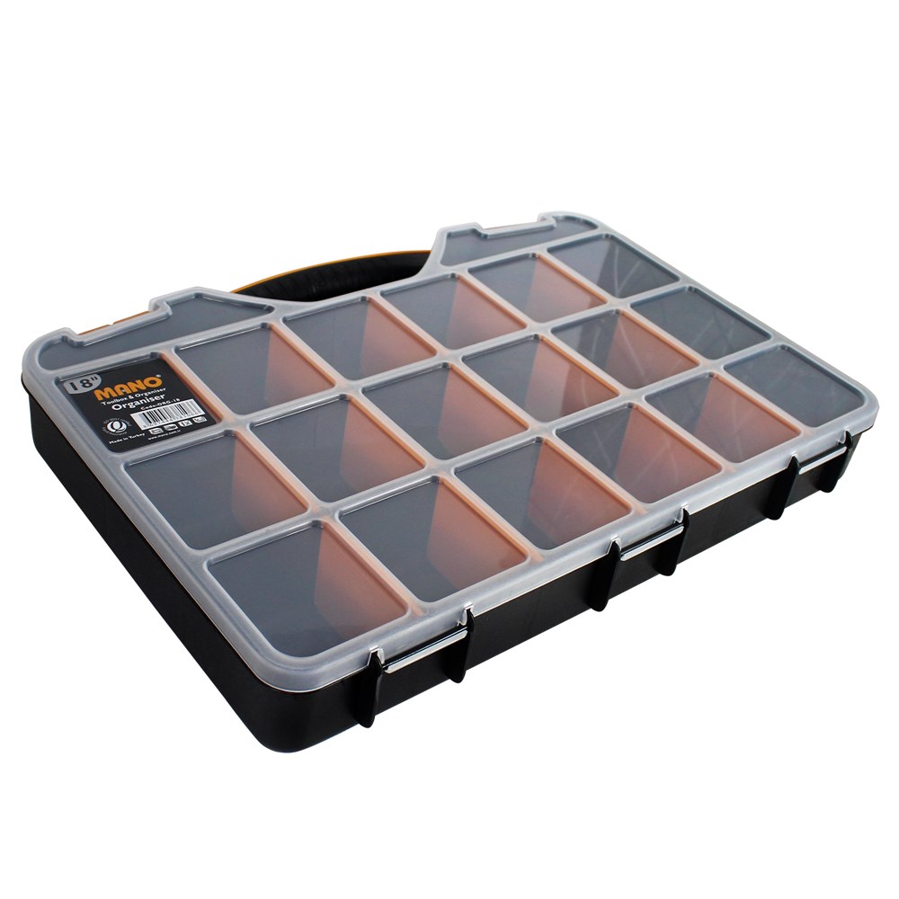 This 18-Compartment Small Parts Storage Organizer features deep, adjustable compartments that are great for organizing small parts and tools.It is easy to carry with you. This plastic storage case has 2 locking tabs , so parts stay in place. Plastic construction for durable, rust-resistant small parts organizing 6 adjustable compartments for versatile storage Built-in handle for easy carrying 2 locking mechanisms help prevent spills Includes additional dividers for convenienc