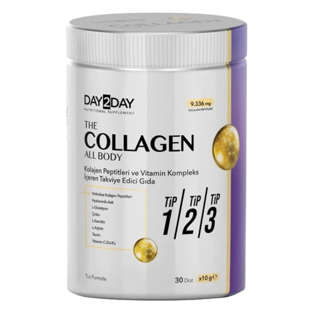 Day2Day The Collagen All Body is a food supplement in powdered form containing 9366,6 mg collagen peptide, glutathione, hyaluronic acid, vitamin and mineral complex.Recommended daily use dosage is 10 g (1 scoop) per day.10 g (1 scoop) of The Collagen All Body in your water or other foods and consume daily.