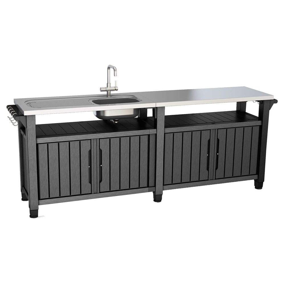 Outdoor table, with a structure composed of resin and aluminum material, with dimensions of 237x52x90 cm, in dark gray color. The table is equipped with a dishwasher, cooking surface and shelves for placing cooking equipment. The composite material is resistant to atmospheric conditions and the outer surface is coated with anti-UV paint, which protects the paint and material from fading and degradation caused by prolonged exposure to the sun. This product is suitable for outdoor use. Please note that the tap is not included