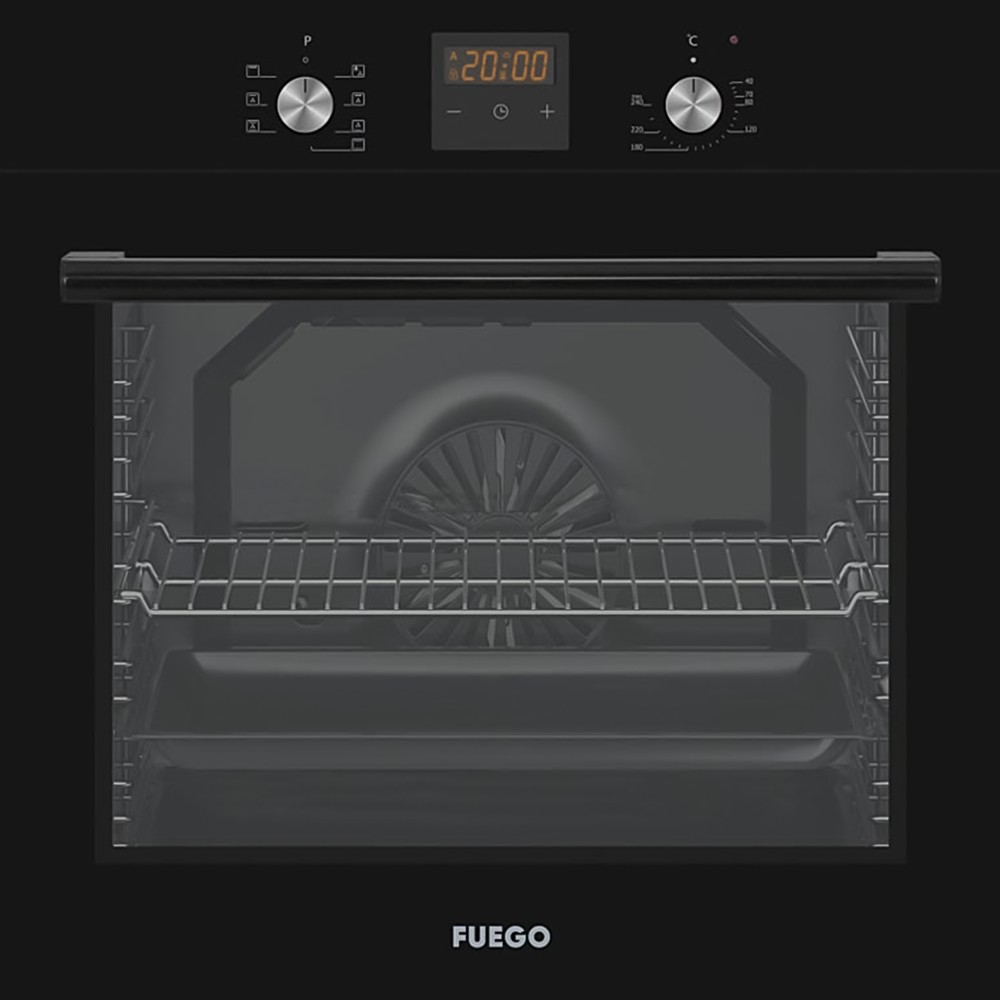 Built-in ovenFuego with capacity 80 Lt. Black enamel and black glass on the door. Black buttons. With a mechanical timer. 8 functions. Grill + fan. Energy class A