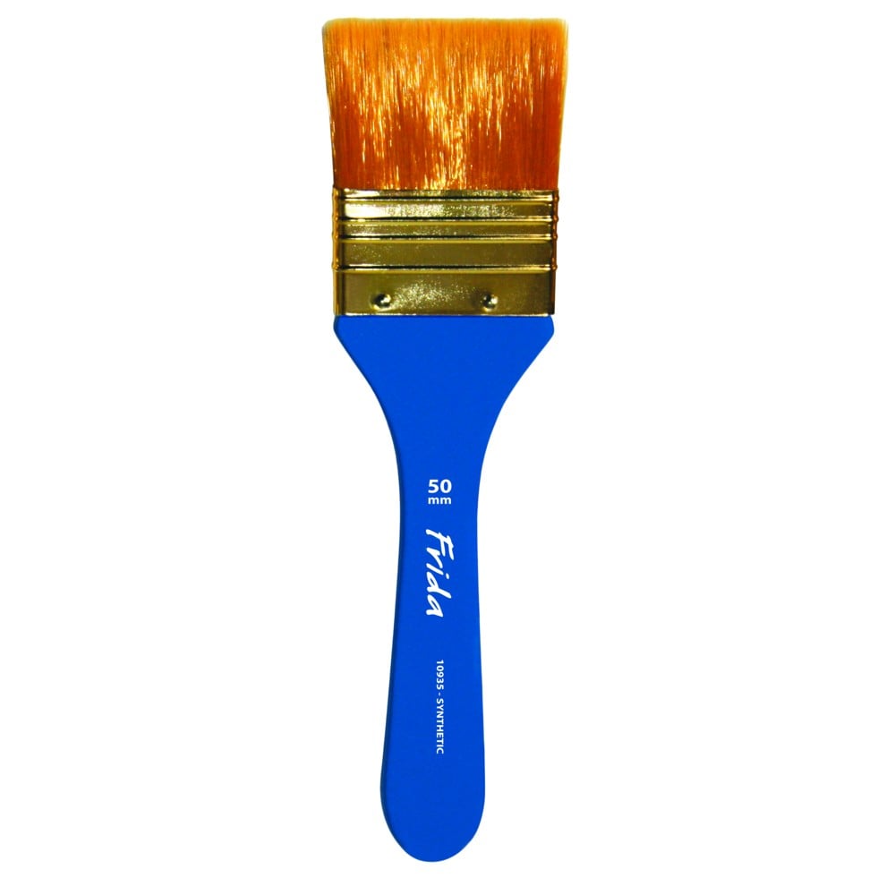 DOM Frida brush with synthetic hair, brass ferrule, blue painted handle. Nickel-plated brass ring nut. The peculiar shapes that make up this line are designed with the aim of helping the hobbyist in quickly creating pictorial strokes of various shapes and sizes with any color, on any support. Synthetic fiber yarn particularly suitable for water-based and acrylic colours.