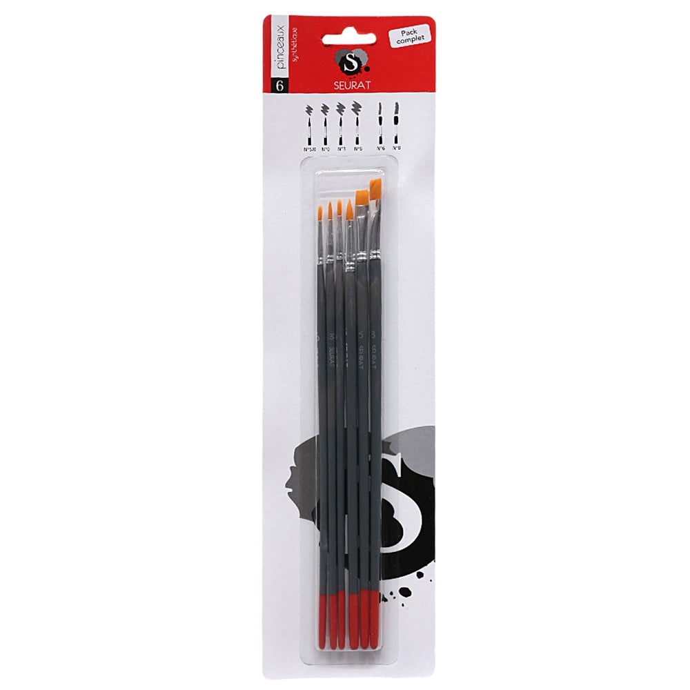 Painting brush set, Seurat, consisting of six brushes with a length of 20 cm and a wooden handle. Used for applying colors in various painting techniques such as acrylic, watercolor or tempera, offering precision and control during artistic work. The brushes are equipped with resistant synthetic fibers and an ergonomic wooden handle, which ensures comfort during prolonged use. This product is suitable for professional use by artists and art students, as well as for non-professional use by amateurs and children passionate about painting.