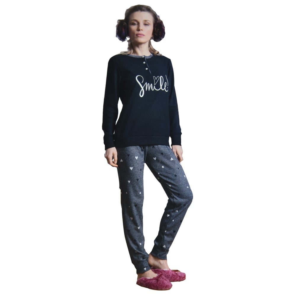 Pajamas for women, Jacquard model, which include a round neck shirt, with three buttons and long sleeves, with bottom band and cuff, and a pair of long pants, in blue color, made of 70% polyester and 30% cotton , with hypoallergenic and antibacterial properties, which does not cause skin irritation, absorbs excess moisture, is hygienic and has body temperature regulating properties. This product is suitable for daily use.