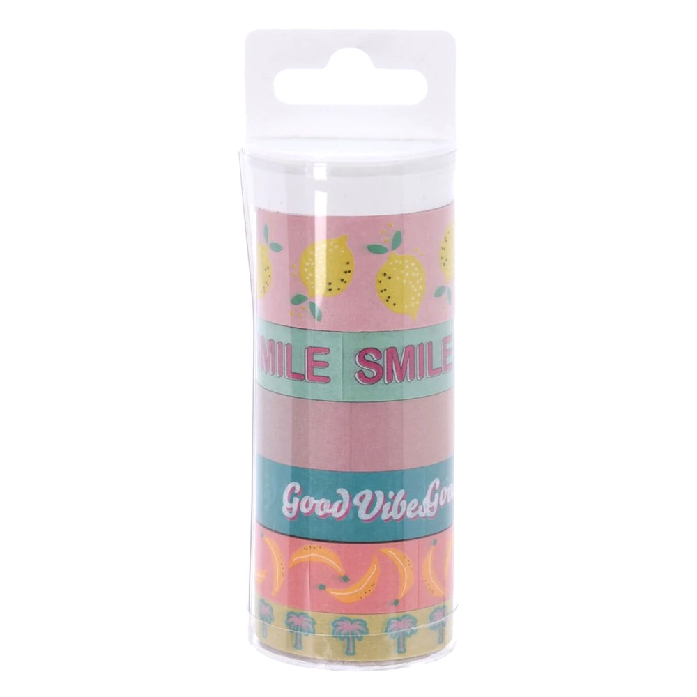 Pack of 6 washi adhesive tapes with writings that recall a good mood. Practical for school. office. home and as a small gift idea but above all to personalize your bullet journal! The cheerful colors and the typical prints release HAWAIAN VIBES everywhere. studying and working and writing about your day will be more fun! Assorted in different heights