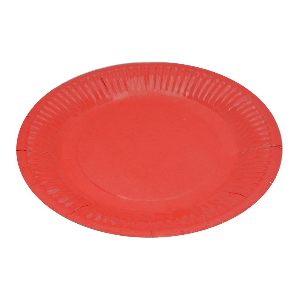 Disposable red plates, made of cardboard material, in red color. They are used in various events such as parties, birthdays, etc. to serve food, avoiding mess and dirty dishes. The material is hygienic and certified for food safety. This product is practical and easy to use.