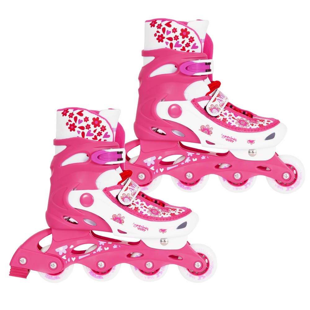 Amila skater has a stylish design with fashionable colors and multiple sizes to choose from. It's stretchable, so kids can enjoy it for a few years without worrying about losing their size! Adjustable shoes in three sizes with locking lever at cuff and 45-degree strap for better fit and stability. Structured semi-soft skates with ventilated mesh, thick engineered mesh lining and seamless toe cap for ease use and improve comfort. Features integrated brakes, lightweight wheels and a fixed cuff for lateral support and balance