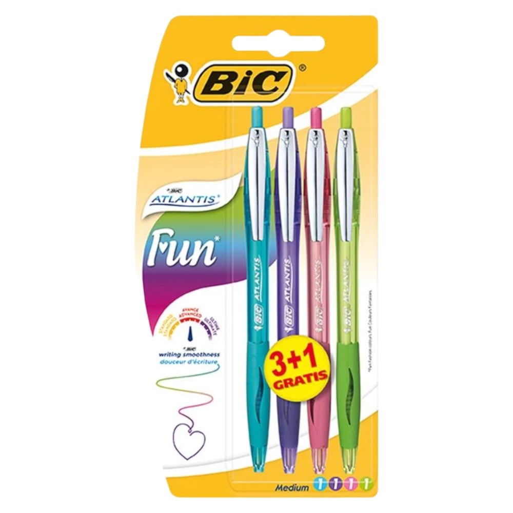 BIC Atlantis Exact Fun pen, 4 colors. This set includes pens with clear and soft writing in four different colors, designed for comfortable and everyday use.