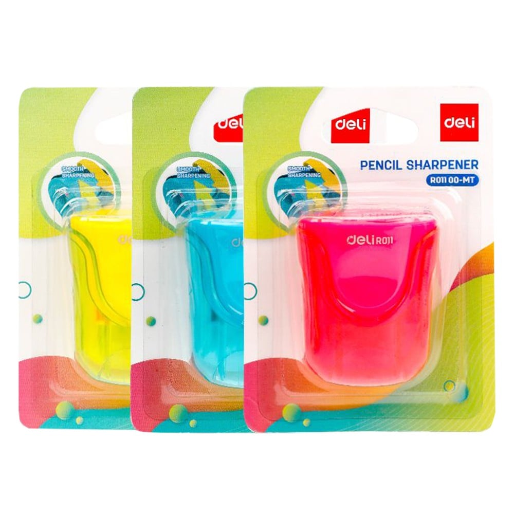 Deli pencil sharpener, plastic, mixed colors. Designed to keep pencil tips sharp and ready for use. Practical and durable, suitable for home, school and office use.