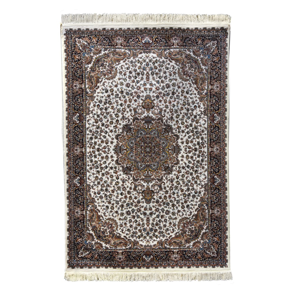 Persian rugs made of polyester. The classic beige design focuses on the central emblem where the base is cream (or lighter beige). Cotton fringes and a very high density of 1 million 200 thousand knots per square meter give this carpet quality and longevity. Thanks to the density, the carpet is safe from impurities, because if it is cleaned immediately, they will not be able to penetrate the base of the carpet. Pile high 6mm. Recommended to wash professionally.