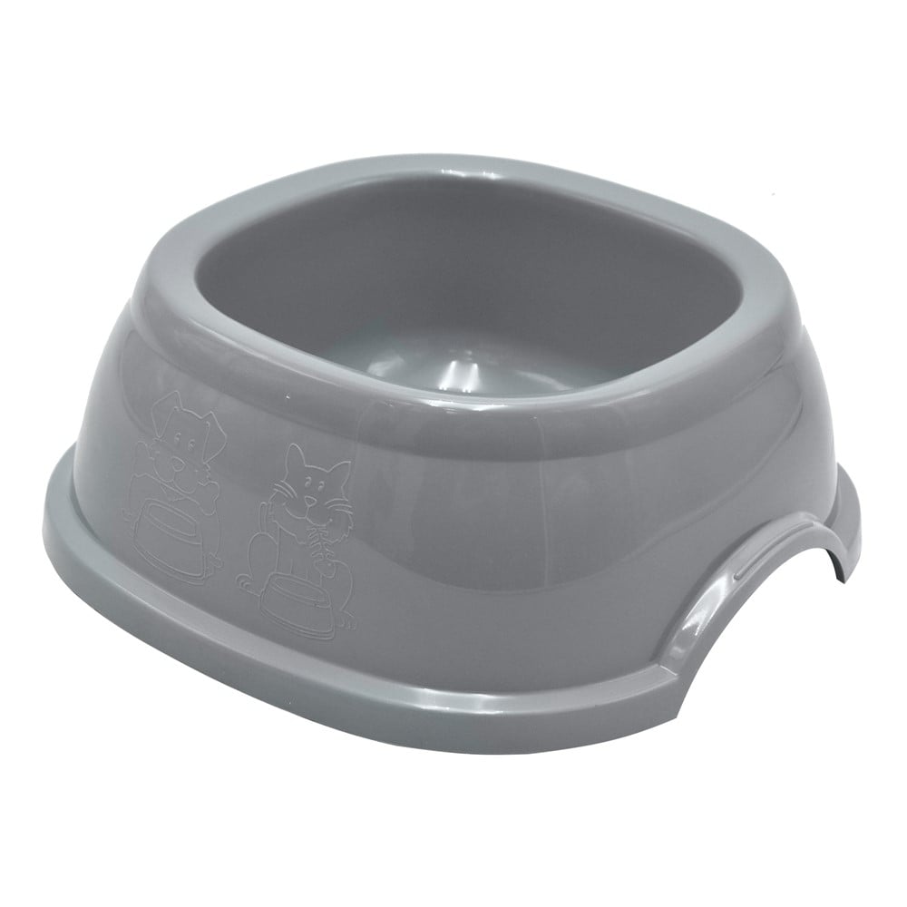 Dimensions of 22 x 22 x8h cm and made of pure plastic. Provides water supply and pet food with small and medium body size. The non-uniform geometric shape makes it easy to consume food and drink water, also the raised back part, avoids spilling food. Stability is ensured through the rubber at the bottom.