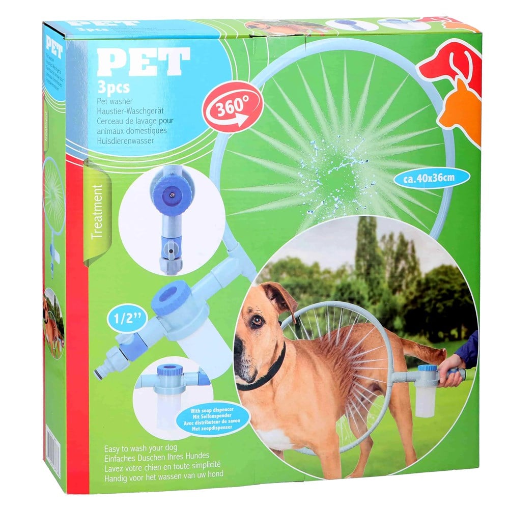 A handy and easy way to wash your dog. Connect the washing machine that is shampooed and this ensures that the dog is bathed in several places at the same time.