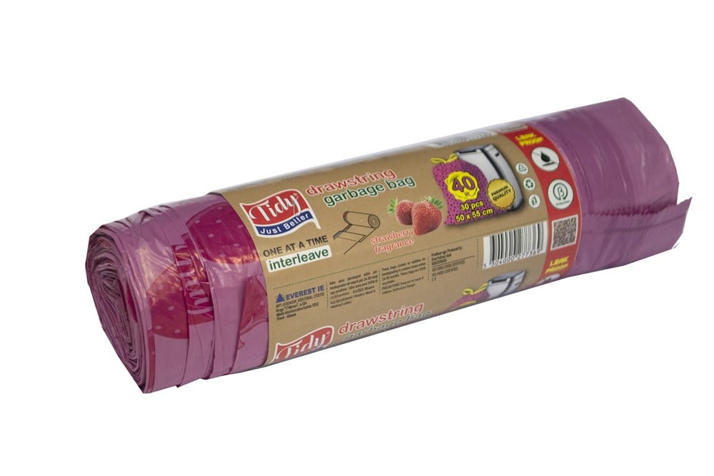 Plastic bags made of resistant plastic material, with a weight-holding capacity of 40 l, with strawberry scent, in pink color. The constituent material contains additives for biodegradation in nature for 24-36 months from production and is 100% recyclable. It is used to be placed in recycle bins, to contain the waste, without leaving dirt and impurities. This product is suitable for use in indoor and professional environments, such as hotels, restaurants, offices, etc.