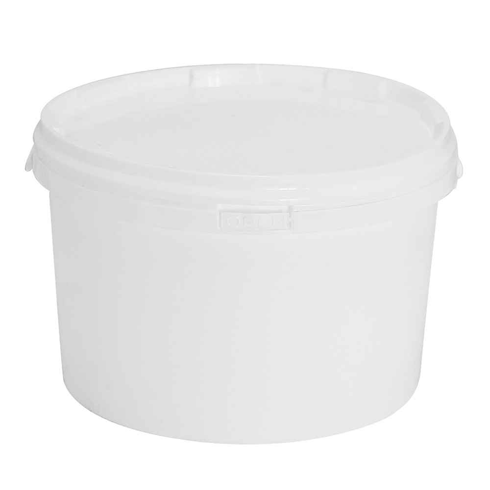The white circular plastic bucket with a capacity of 5 liters is a suitable solution for many uses, especially for the food industry. This product offers a simple and efficient solution for their transport and storage.