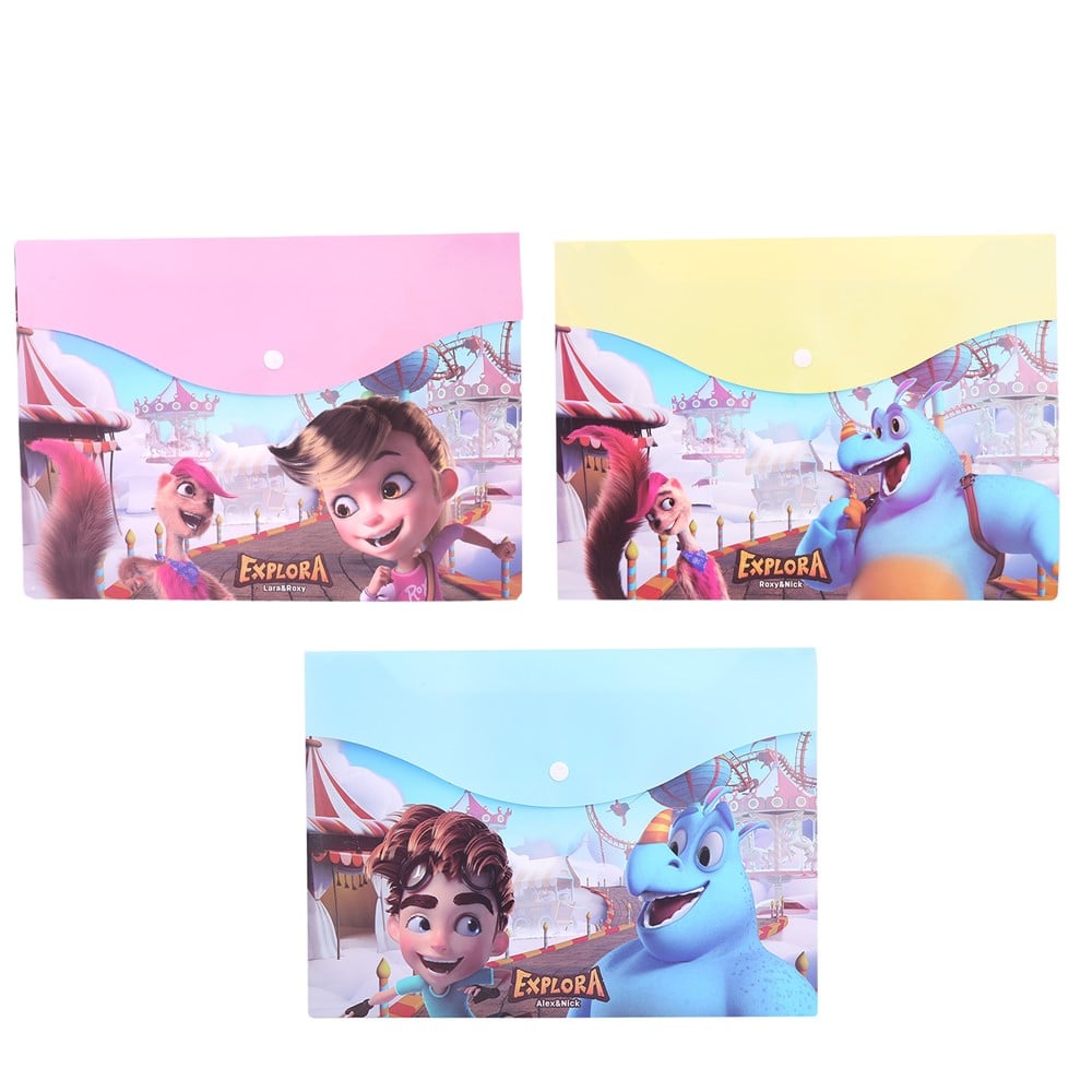 Envelope in the form of a button, with a button and various cartoon images. Convenient when transporting documents and storing them.