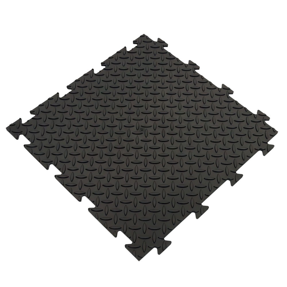 Floor tile in PVC, surface with design in relief like “grain of rice”. Fit for workshops, garages, gym centre, events, games rooms, factories, temporary floor protection, loading plane of vehicles. Caracteristics: durable and strong, easy to clean, good thermal and