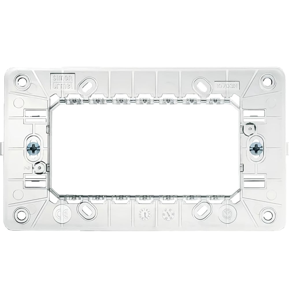 Plastic support, 4 modules, Simon Urmet brand. Offers the possibility to mount up to four electrical modules, such as switches, sockets and other accessories. Easily adapts to modular systems and ensures a clean and functional installation. Its simple and durable design makes this product suitable for domestic and commercial environments.