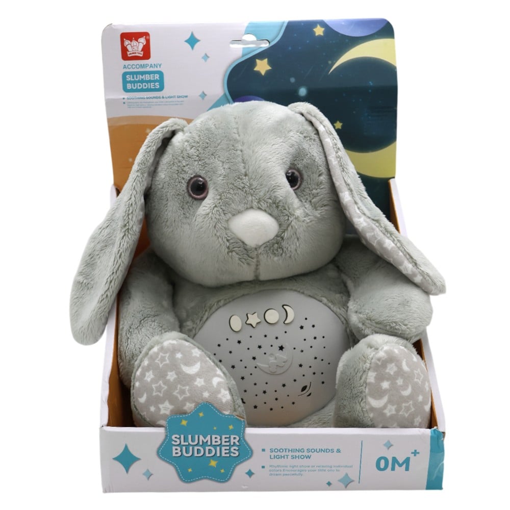 A soft and magical friend for children. This plush bunny has a light-up function and pleasant sounds, providing companionship, tranquility and fun. With a size of 34 cm and a neutral gray color, it is perfect as a gift for any child.