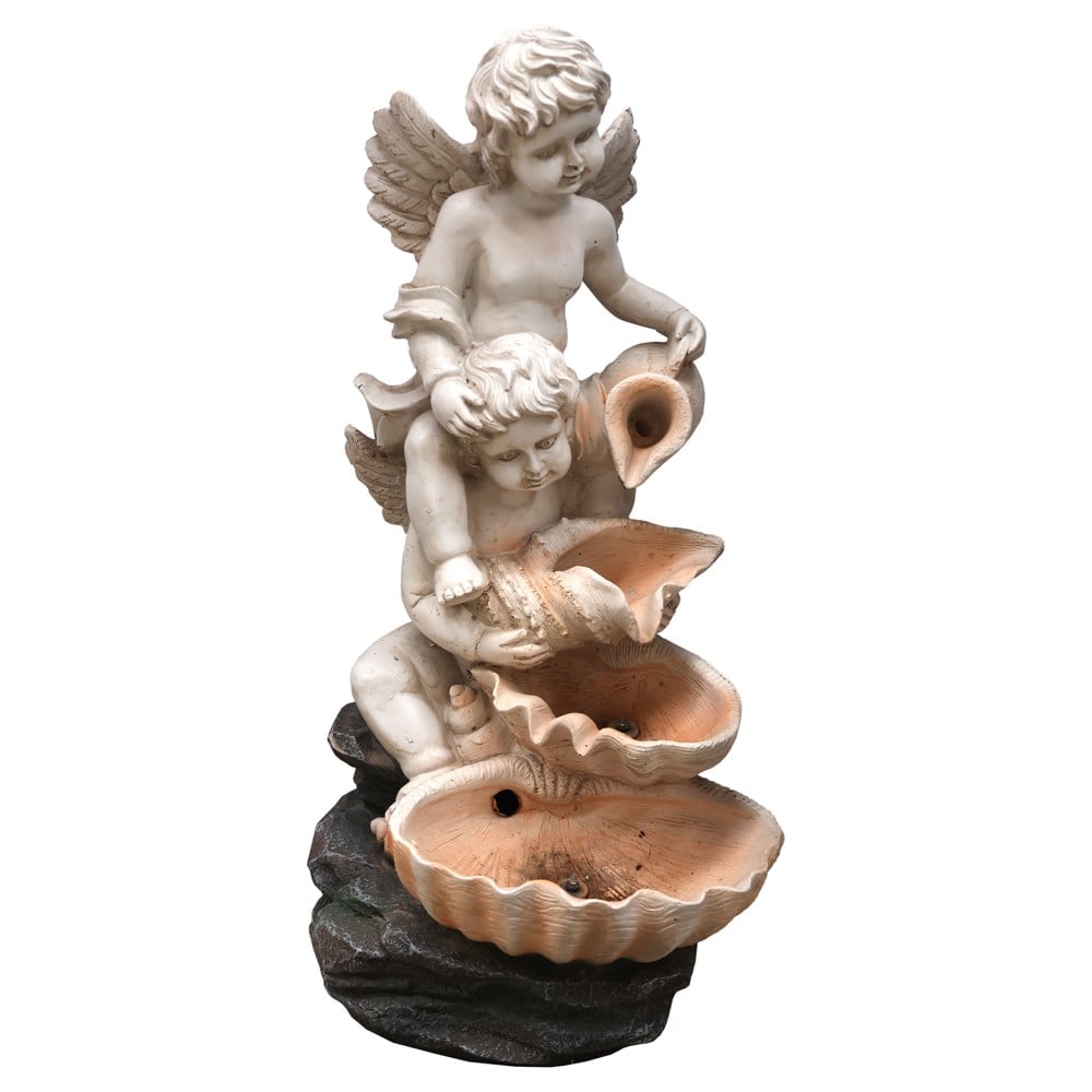 Polyresin fountain "Angel", W/three LED with water pump with 10m cable. Product size:31x32x59cm. They have the appearance of natural stone. To add a relaxing and beautiful element to your surroundings and to bring nature near you, this fountain is the solution. They can be placed inside or outside.
