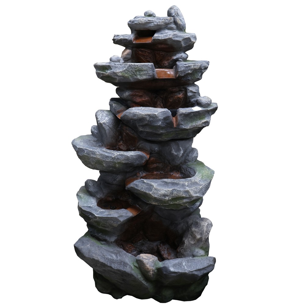 Polyresin fountain W/six LED with water pump 10m cable. Product size:82x63x159cm. They have the appearance of natural stone. To add a relaxing and beautiful element to your surroundings and to bring nature near you, this fountain is the solution. They can be placed inside or outside.