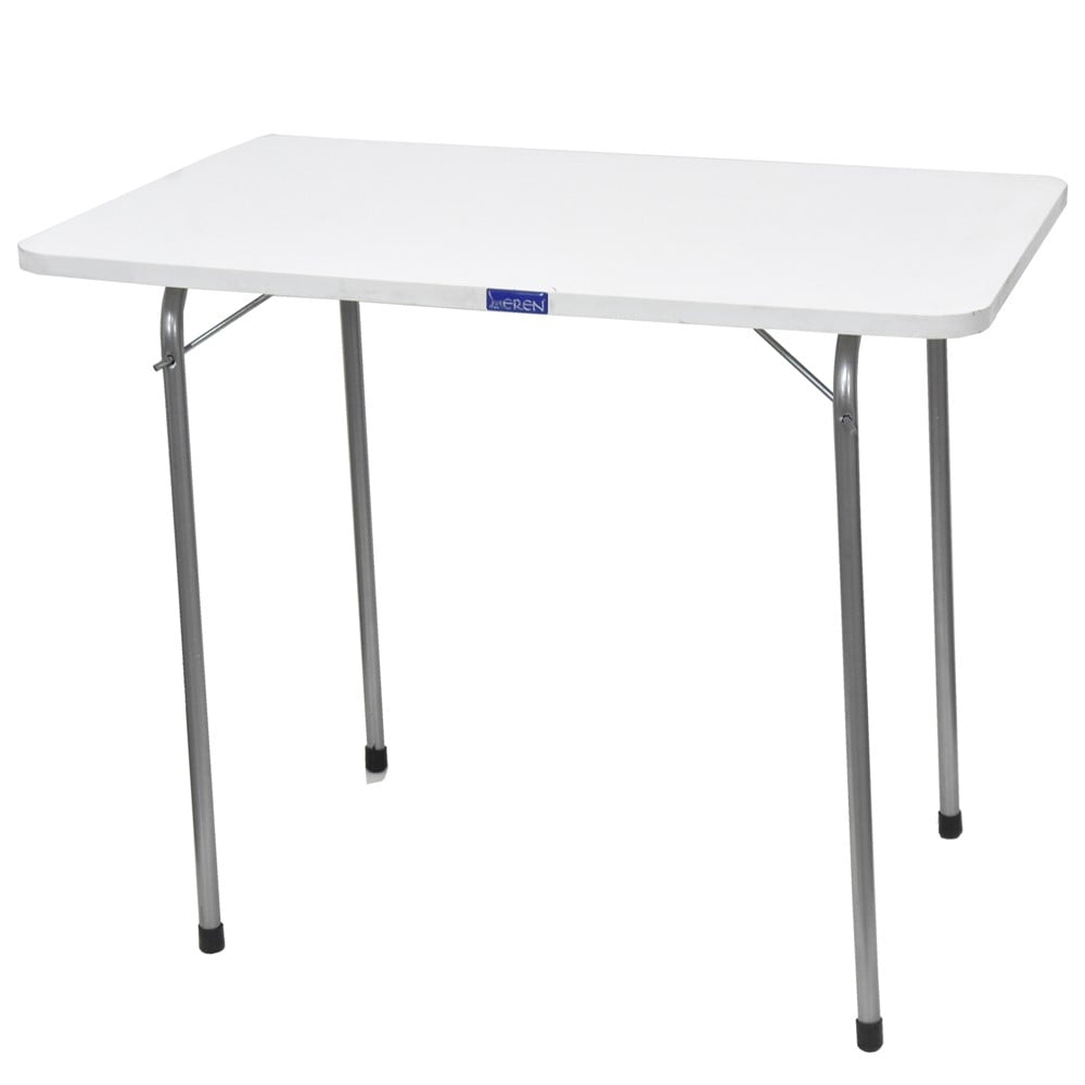 Portable camping table, with a stable support structure, made of metal material, with dimensions of 60x80 cm. The table surface is made of pressed wood material, in white color. It can be used on camping trips, picnics or on the beach and can be easily transported thanks to its compact dimensions.