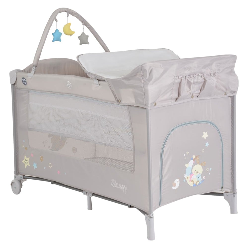 Portable bed with two levels, with a supporting structure made of durable aluminum and plastic material and a cover made of anti-allergic and antibacterial polyester material. The bed has a side opening with a zipper, a folding system, a hanging toy, and a carrying bag. It can be used as a children's bed, as a play area and as a portable bed that is easily foldable and compact to take with you on trips. This product is suitable for children aged 6 - 36 months, weighing up to 15 kg.