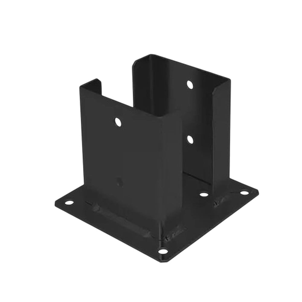 Rail holder, made of metal material, with dimensions 101x150x2.5 mm, in black color. It is used to facilitate the assembly of wooden elements with concrete surfaces, ensuring a stable installation of the wood on the base. The component material is resistant to use, heavy weights, rust or corrosion. It can be easily installed using screws.