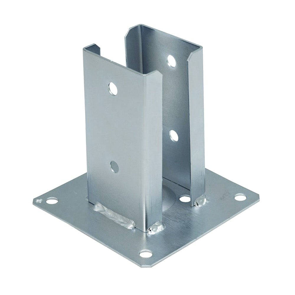 Post support basis, made of metal material, with coating layer with zinc powder, with dimensions of 7.1x15x0.2 cm, in gray color. It is used to facilitate the assembly of wooden elements with concrete surfaces, while ensuring a proper expansion of the wood from the ground. The constituent material is resistant to use, heavy weights, rust or abrasion. It can be easily installed using screws.