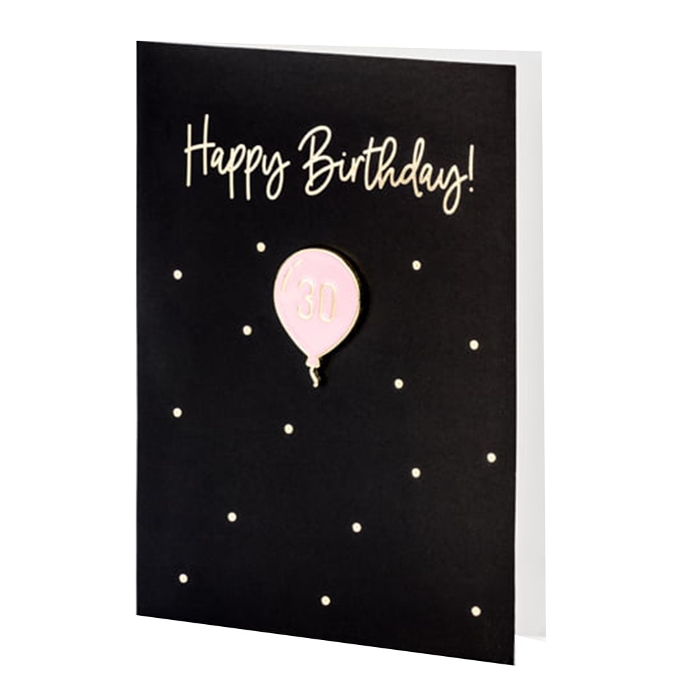 Happy Birthday card, made of paper material, with dimensions of 10.5x14.8 cm, in black color, with inscription and decorations in metallic golden color. The postcard is equipped with a pink envelope and a decorative pin, in the shape of a balloon with the number 30, made of enamel-coated metal material, with dimensions of 2.5x3.5 cm, in gold and pink color.