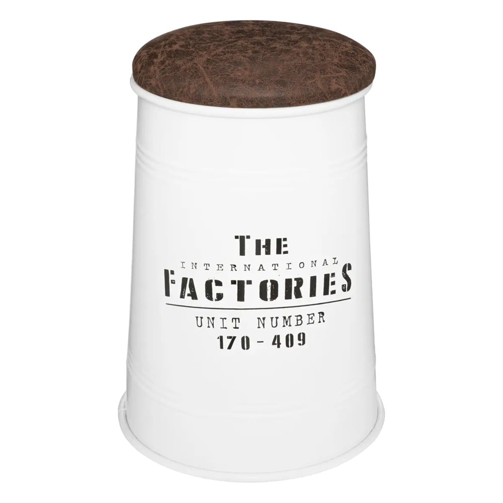 The retro design offers a distinctive stylish look. Pouffe in a matte tone, decorated with inscriptions in vintage style. Everything is complemented by a comfortable seat in old imitation leather.