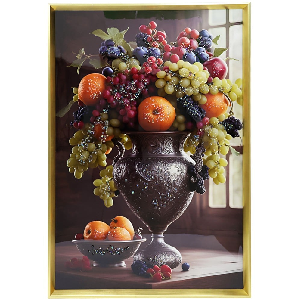 This printed painting with motifs, placed in a golden MDF frame measuring 60xH90 cm, is a decorative element that brings freshness, color and life to any space. The detailed print and the vibrant colors of the fruits create an attractive atmosphere, ideal for giving positive energy to the kitchen, living room or other everyday spaces. The carefully crafted details give it a very pleasant realistic look and another dimension. Modern and classic, minimalist but also sophisticated, this painting is a wall decorator with curated details. With large dimensions of 60x90 cm, this painting functions as a reference point on the wall, adding color and character to your interior.