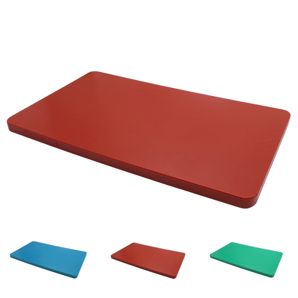 This professional cutting board, made from high-quality red polyethylene, is an excellent choice for both professional and home kitchens. With dimensions of 50 x 30 x 2 cm, it offers a large and stable surface for cutting a variety of foods, from vegetables and fruits to meat and fish. Polyethylene is a material known for its durability, resistance to scratches and stains, and its hygiene. It does not absorb liquids or odors, making it easy to clean and safe for everyday use. The red/blue/green color gives the board a clean and professional look, making it suitable for any kitchen environment. In addition to its practical and hygienic aspects, this cutting board is also easy to maintain. Simply clean it with warm water and soap, and dry it immediately after use.