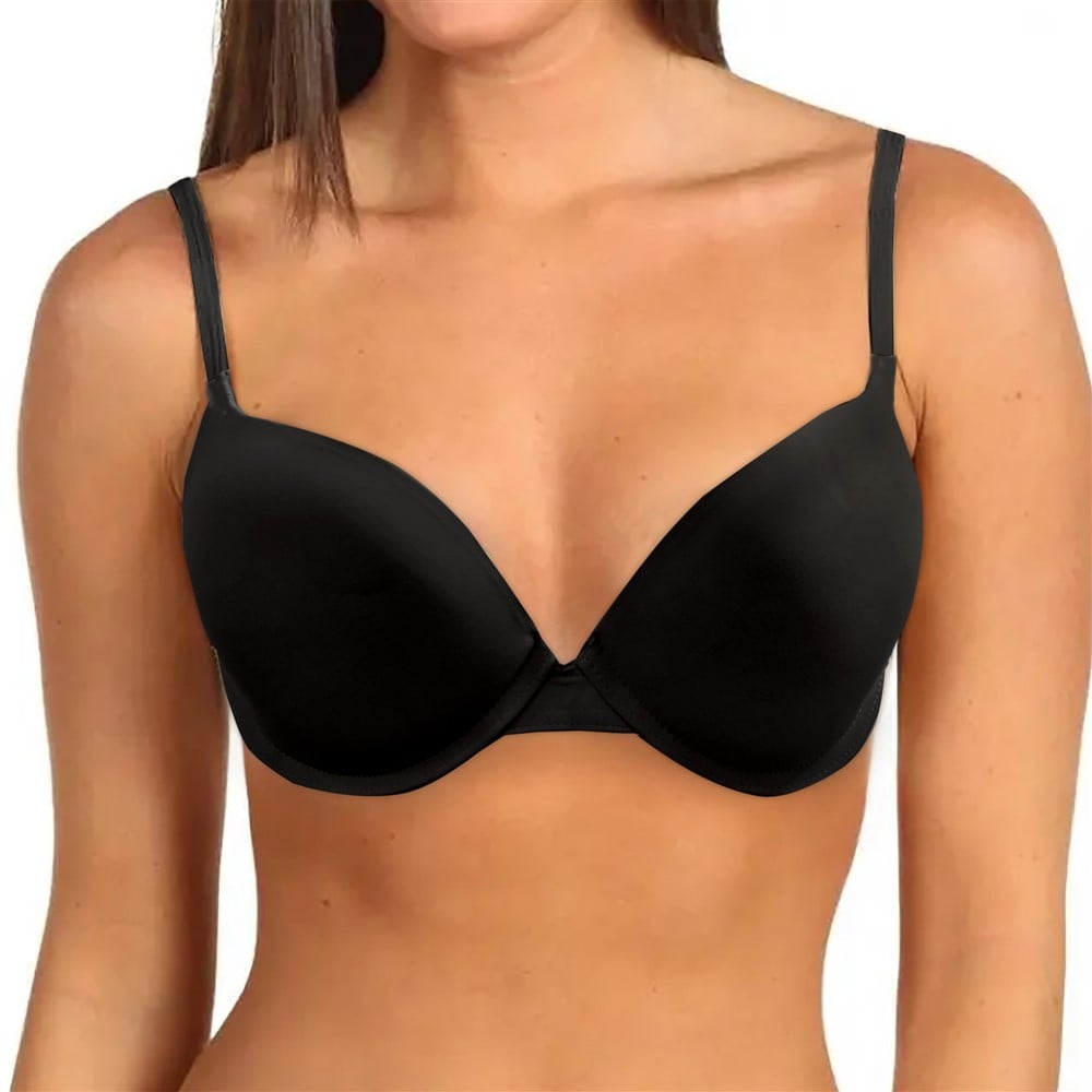 Push-up bra for girls, made of microfiber material, composed of 85% polyamide (nylon) and 15% elastane, with soft foam filling, in black color. The seamless design is equipped with "B" cups and reinforced underwire structure at the bottom of the chest, which allows the product to easily fit the body shape. The bra are equipped with fixed straps on the front and detachable and cross-over straps on the back. The constituent material does not cause skin irritation, it is hygienic, it allows the skin to breathe, it has hypo-allergenic properties and absorbs excess moisture. This product is suitable for daily use.