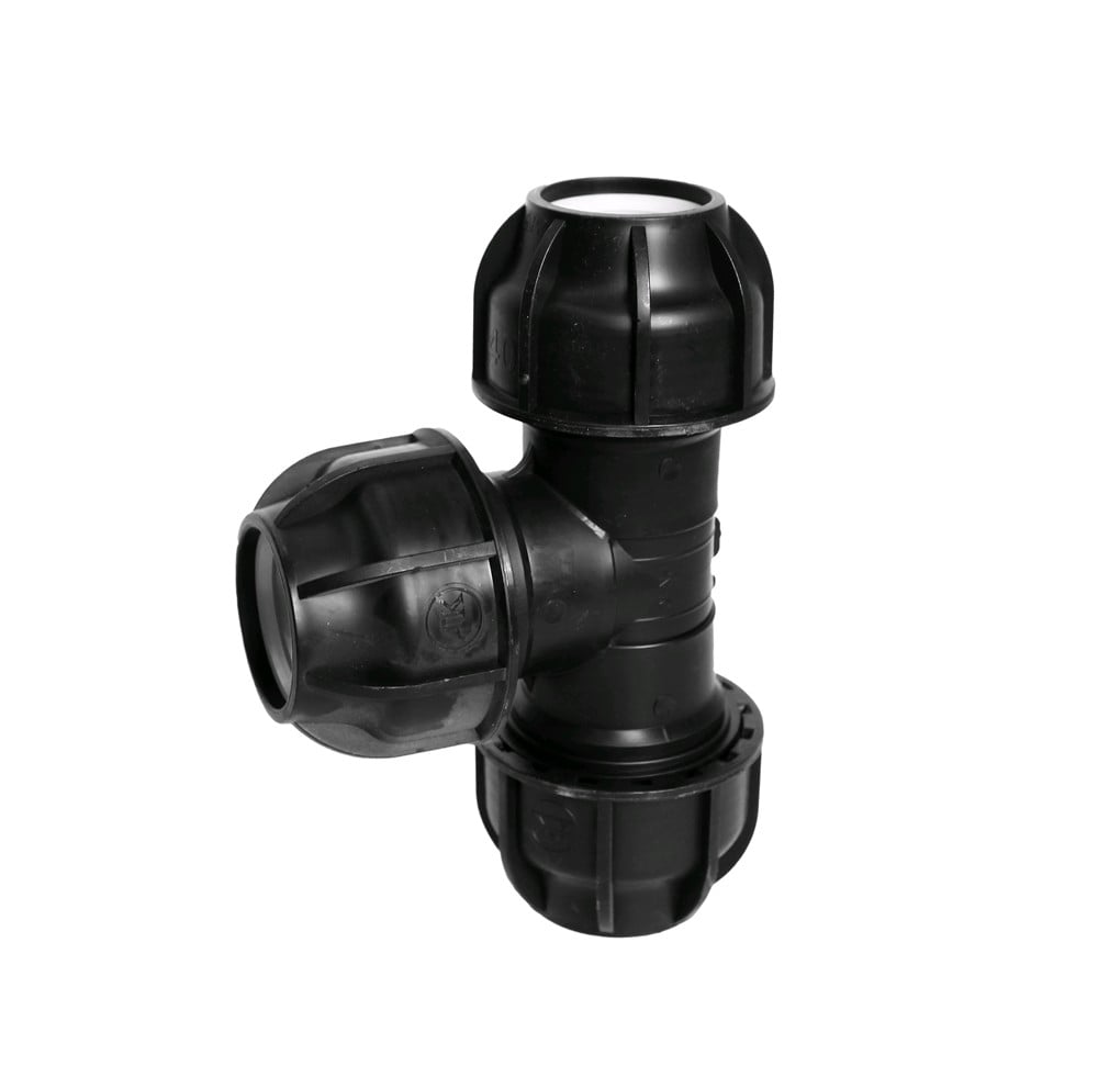 Tee with faucet of PP 40x40x40 mm with angle 90°. Used to installations angular water supply infrastructure lines, in irrigation and agricul, etc. The tee enables network branching 90° angle. The tee network connects three pipes through coercive mechanical faucet. Manufactured with European standards, resistant to corrosive materials designed to withstand pressure up to 10 Bar.
