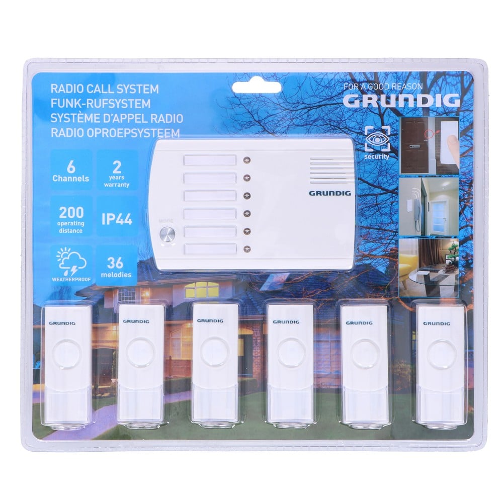 Radio call system with 6 transmitters (doorbells) and 1 receiver, Each transmitter functions as a channel and is suitable for outdoor use (protection value IP44), The receiver can be set with 36 melodies, Both the transmitters and the receiver can be provided with name cards, With a call, the LED of the relevant channel on the receiver will flash and the preset notification tone will be played through the speaker. The max. range is 200 meters indoors (under the most optimal conditions, in practice this will be less), The transmitters work on CR2032 button cell (these are included), the receiver works on 3x AA batteries (not included)
