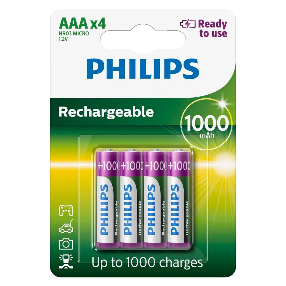 Ideal for all your digital applications. These high-capacity AAA batteries do not need to be completely discharged before recharging. You can recharge the batteries whenever you want. In addition, these batteries can be recharged up to a thousand times. 1000 mAh rechargeable AAA The 1000 mAh of energy keeps your toys and other general devices running for longer. Nickel Metal Hydride With Nickel Metal Hydride technology, batteries can be recharged multiple times, making replacement virtually unnecessary. No loss of capacity after use A nickel metal hydride battery can be recharged up to 1000 times without being completely discharged.