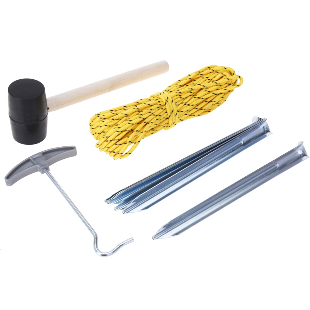 Set of camping accessories from metal material of pegs, hammer wood, and textile of connecting rope. The set includes 1 hammer, 1 rope, a peg, and 6 metal pegs. Used for fixing camping tents in difficult terrain, for resistance to atmospheric conditions.